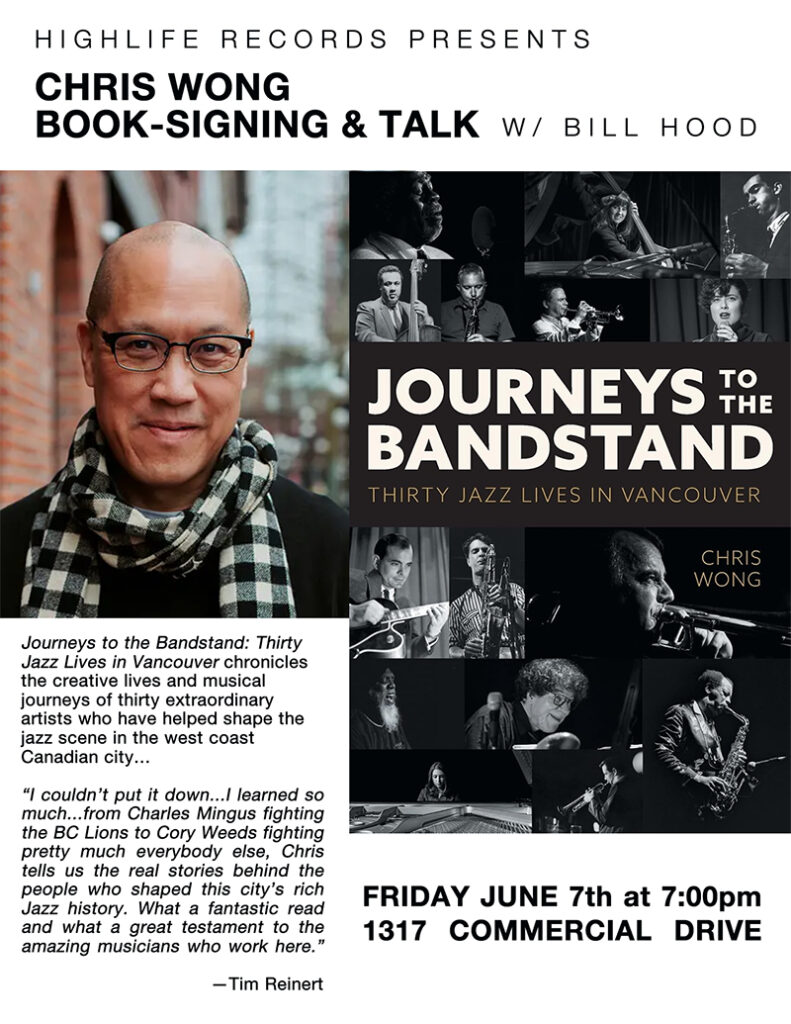 Highlife Records, the longstanding music store at 1317 Commercial Drive that sells vinyl, CDs, tapes, books (including Journeys to the Bandstand) and other items, will feature Journeys to the Bandstand at an in-store event. At the event, Chris will talk about the book, read excerpts from it, and answer questions in a live interview with Highlife jazz specialist Bill Hood. A few tracks that Chris wrote about in the book will also be played.